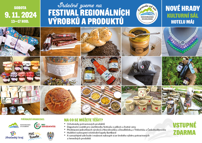 Destinační spolek Novohradsko-Doudlebsko bude v sobotu 9. 11. 2024 pořádat 3. ročník Festivalu regionálních produktů a výrobků. Festival se uskuteční v Nových Hradech a jsou na něj pozváni výrobci, kteří jsou sdruženi pod naší značkou Opravdu od nás a další výrobci, kteří tuto značku nemají a kteří jsou ze sousedních oblastí (Třeboňsko, Českobudějovicko, Českokrumlovsko).