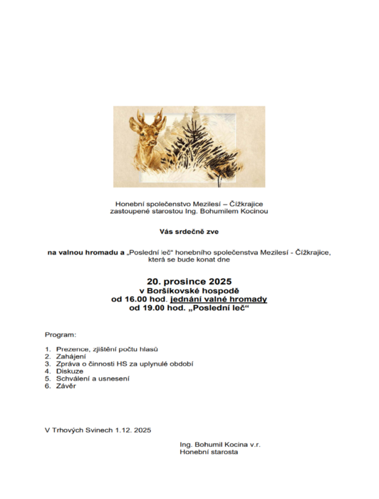 Pozvání na valnou hromadu Honebního společenstva Mezilesí - Čížkrajice